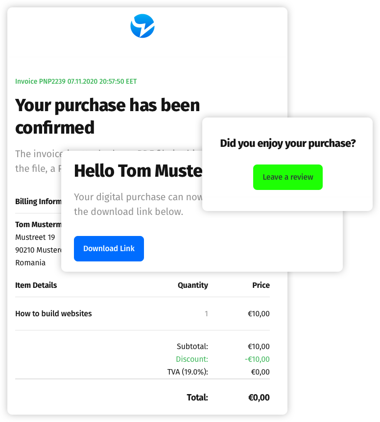 Spend 10 minutes setting up your checkout flow, start promoting your checkout page and let plug&paid do the rest: collect payments, issue invoices, distribute files, gather reviews and grow your email list...